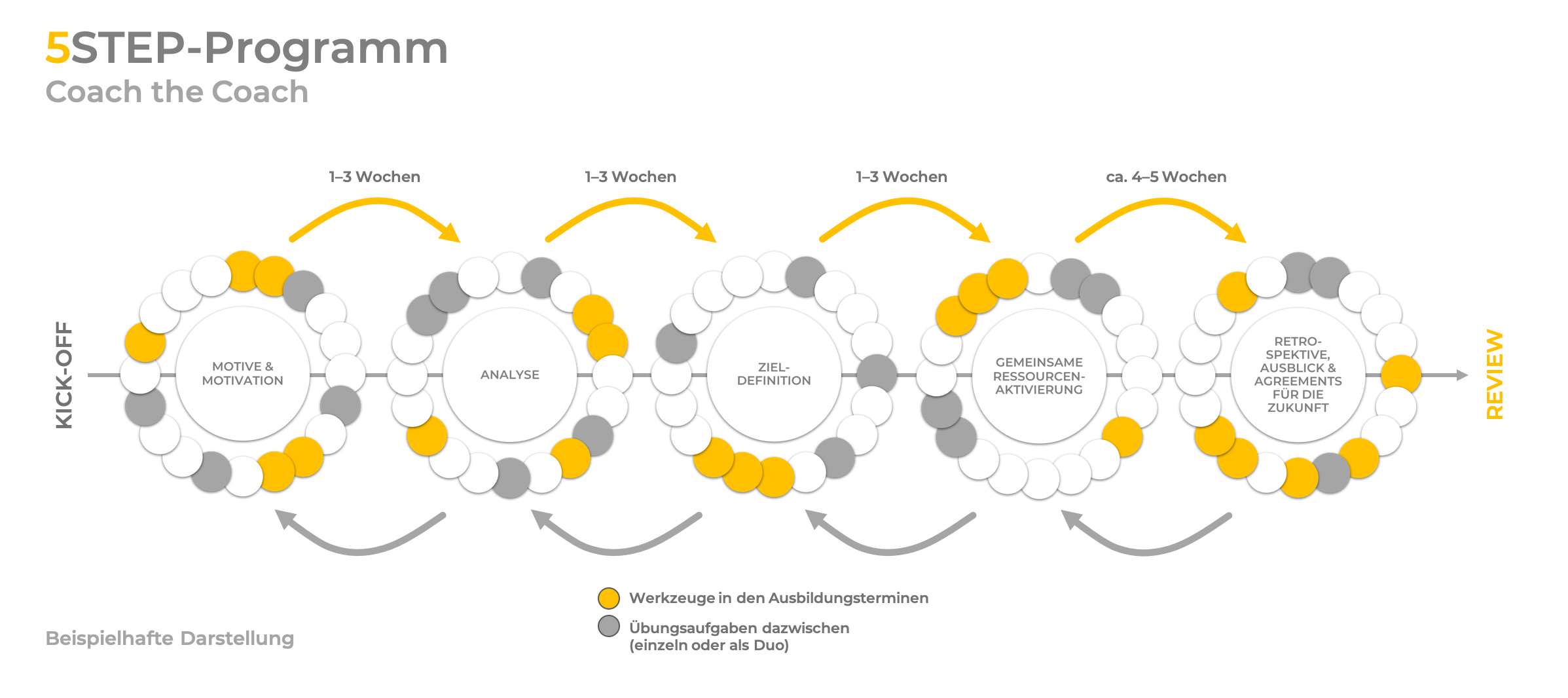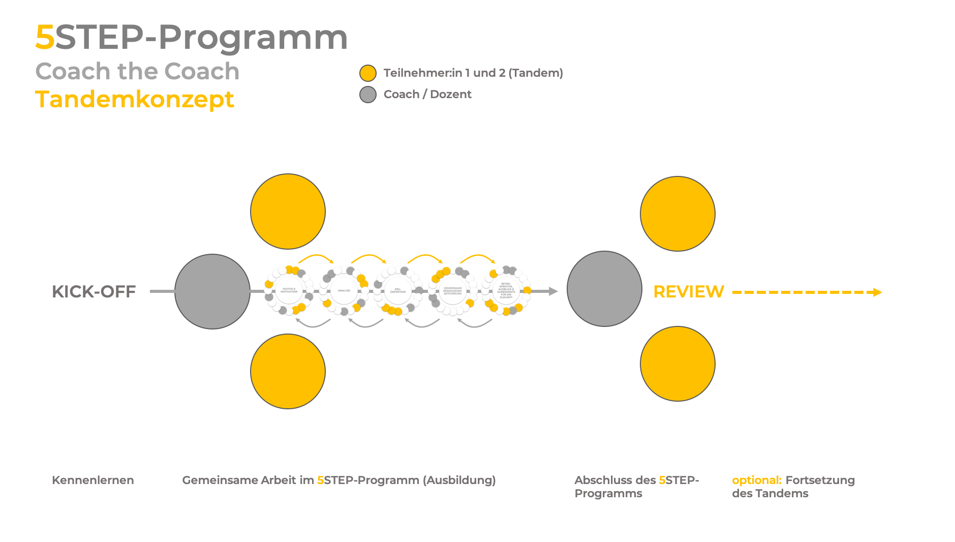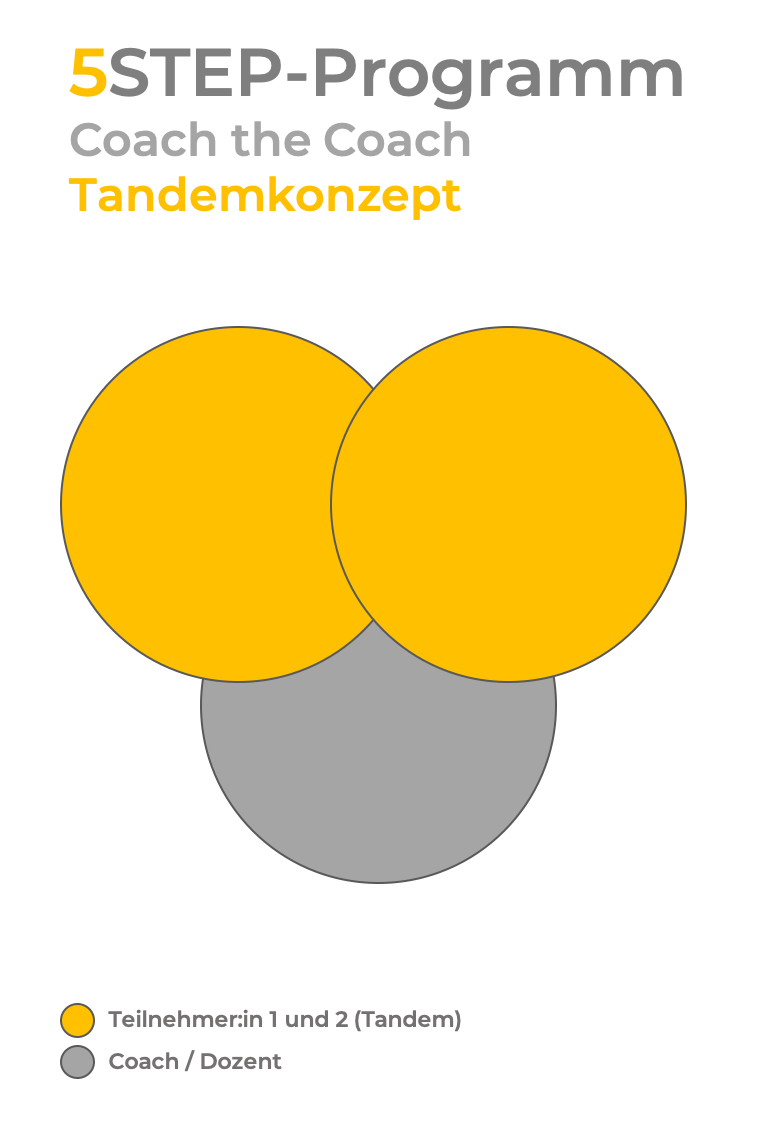 Das Besondere an der Ausbildung „Coach the Coach” neben der transdisziplinären Palette an Modellen, Methoden und Werkzeugen ist das 5STEP-Tandemkonzept: